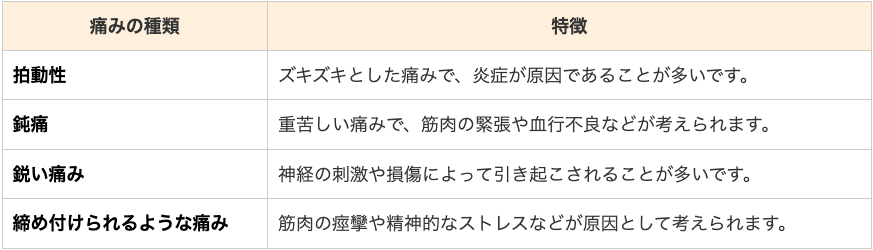 首の痛みは、その原因や状態によって様々な種類があります。ズキズキとした拍動性の痛み、鈍い痛み、鋭い痛み、締め付けられるような痛みなど、痛みの性質は様々です。また、痛みが持続的に続く場合や、特定の動作で悪化する痛みなど時間的な経過も異なります。