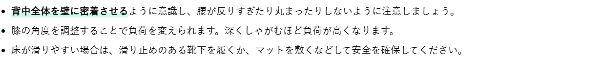 - 背中を壁につけたまま、ゆっくりと膝を曲げてお尻を下げていきます。