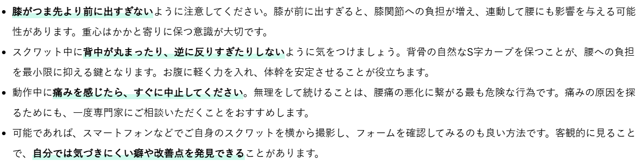 正しいフォームを意識していても、気づかないうちに腰に負担をかけてしまうことがあります。以下のチェックポイントを参考に、ご自身のスクワットフォームを見直してみましょう。