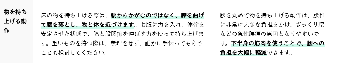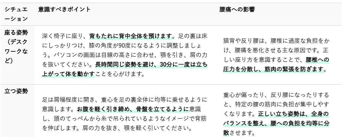 スクワットで得た体幹の安定性や筋肉の強さは、日常生活の中で活かされてこそ真の腰痛改善に繋がります。普段の姿勢や動作の癖を見直すことは、腰への負担を軽減し、腰痛の再発を防ぐ上で非常に重要です。