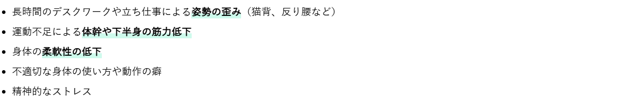 これらの原因により、腰椎やその周辺の筋肉、関節に過度な負担がかかり、痛みとして現れます。特に、体幹や股関節周りの筋肉が弱っていると、腰への負担が直接的になりやすいのです。