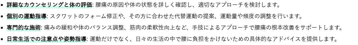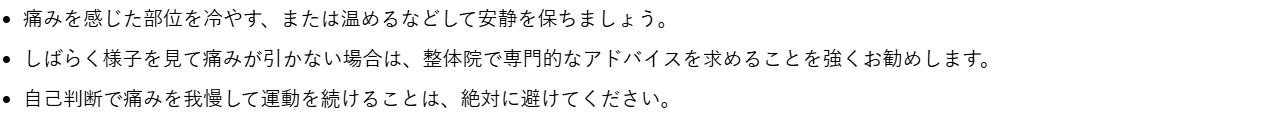スクワット中に痛みを感じた場合や、すでに持病をお持ちの場合は、安全を最優先に行動することが重要です。