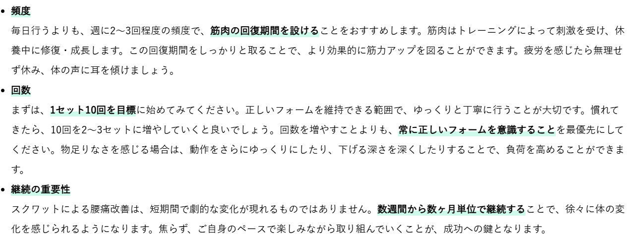 スクワットの効果を実感し、腰痛改善に繋げるためには、継続して実践することが最も重要です。しかし、無理な頻度や回数で追い込むと、かえって体を痛める原因になります。ご自身の体力や体の回復力を考慮し、適切な頻度と回数で取り組むようにしましょう。