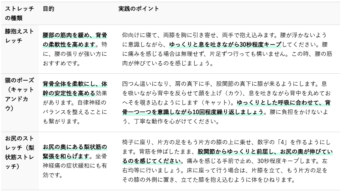 スクワットで鍛えた筋肉の柔軟性を保ち、血行を促進することは、腰痛の緩和と予防に欠かせません。ここでは、腰痛に悩む方が自宅で簡単に実践できる、効果的なストレッチとセルフマッサージをご紹介します。