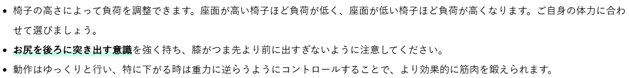 椅子を使ったスクワットは、通常のスクワットよりも膝や腰への負担が少なく、正しいフォームを習得しやすいため、腰痛をお持ちの方や運動初心者の方に特におすすめです。