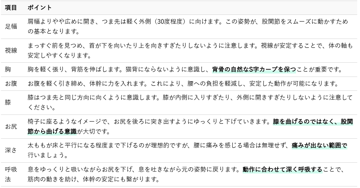 腰痛をお持ちの方がスクワットを行う際、最も重要なのは「安全」に「正しいフォーム」で実践することです。無理な動きや誤ったフォームは、かえって腰痛を悪化させる原因になりかねません。ここでは、整体の視点から、自宅で安心して取り組めるスクワットの実践法を詳しくご紹介いたします。
