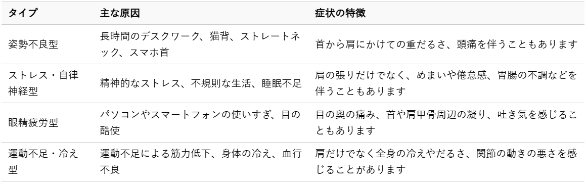 肩こりは、その原因によっていくつかのタイプに分けられます。ご自身の肩こりがどのタイプに当てはまるかを知ることで、適切なアプローチを見つける手がかりになります。