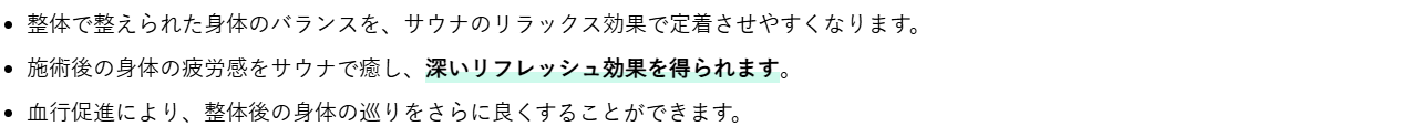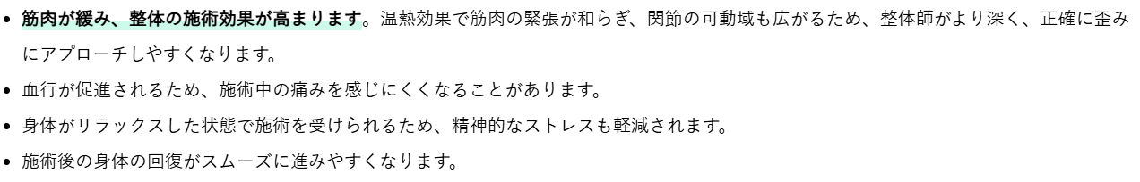 整体で身体の歪みを整えてからサウナを利用する方法も、特定の目的において有効な組み合わせ方です。特に、施術後のリラックスや状態の定着を重視する場合におすすめです。