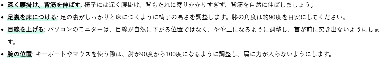 これらの姿勢改善のポイントは、一度に完璧を目指すのではなく、日々の生活の中で少しずつ意識して習慣化していくことが大切です。 意識することで、自然と正しい姿勢が身につき、肩こりの予防につながります。