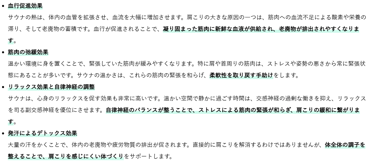 これらの要因が複雑に絡み合い、互いに影響し合うことで、肩こりは一時的な不調から、なかなか改善しない慢性的な状態へと進行してしまうのです。サウナや整体は、この悪循環を断ち切り、根本的な改善を目指すための有効な手段となり得ます。