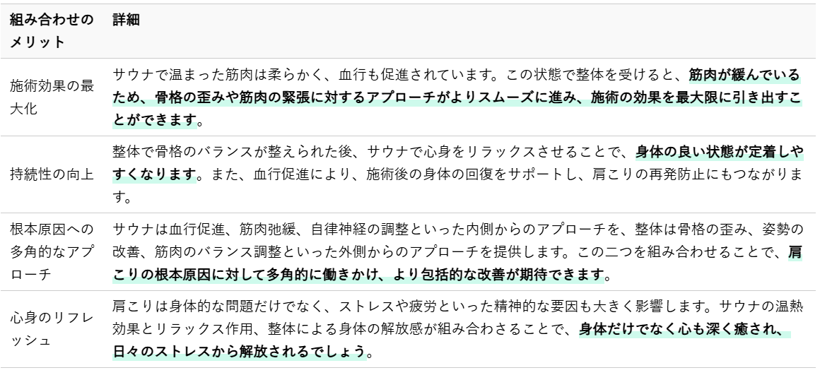 サウナで身体を温め、筋肉をリラックスさせた状態で整体を受ける、または整体で身体の歪みを整えた後にサウナで疲労回復とリフレッシュを図る。このように、サウナと整体を戦略的に組み合わせることで、肩こり改善の効率と効果を飛躍的に高めることができます。それぞれのメリットを掛け合わせることで、どのような効果が期待できるのでしょうか。
