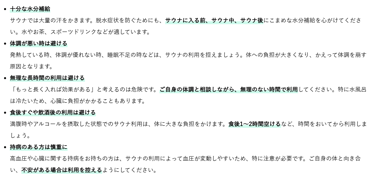 サウナは健康効果が高い一方で、利用にはいくつかの注意点があります。安全にサウナを楽しむために、以下の点に留意してください。