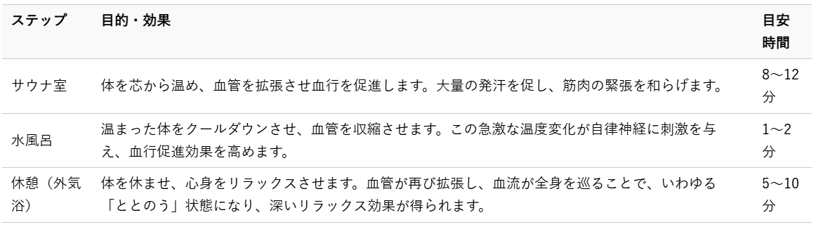 サウナの醍醐味である温冷交代浴は、血行促進に非常に効果的で、肩こり改善に特に推奨される入り方です。以下のサイクルを意識して行ってみてください。