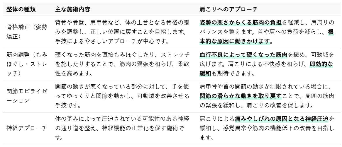 整体と一口に言っても、そのアプローチや施術内容は多岐にわたります。ここでは、肩こり改善に特に関連の深い、代表的な整体の種類とそれぞれの施術内容についてご紹介します。