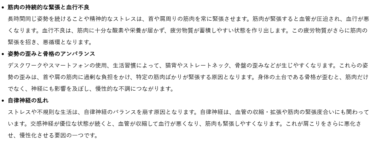 長年の悩みである頑固な肩こりは、血行不良や筋肉の緊張、そして体の歪みなど、様々な要因が複雑に絡み合って発生しています。