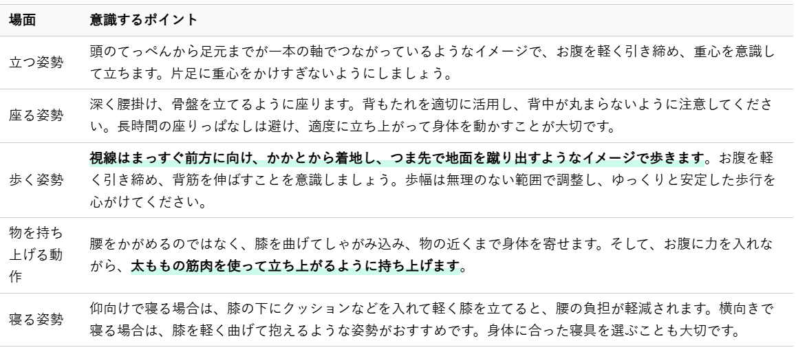 これらの意識を日常に取り入れることで、腰への負担が減り、歩行時の痛みも和らぐことが期待できます。