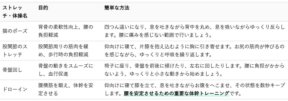 腰痛で歩くのが困難な時でも、無理なく行える簡単なストレッチや体操があります。これらを継続することで、硬くなった筋肉を緩め、血行を促進し、腰の柔軟性を高めることができます。痛みを感じる場合はすぐに中止し、決して無理はしないでください。
