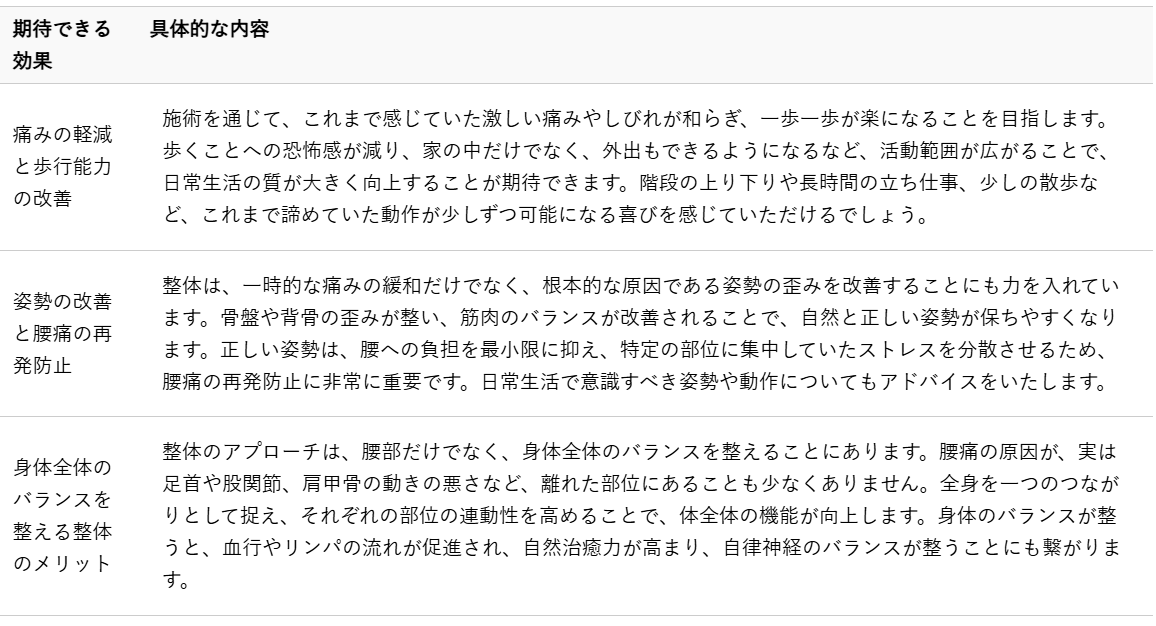 整体によるアプローチは、単に痛みを和らげるだけでなく、あなたの「歩けない」という状況を改善し、活動的な日常を取り戻すための様々な効果が期待できます。