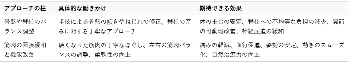 整体が側弯症による腰痛に効果的な理由は、痛みのある部分だけでなく、骨盤や脊柱全体のバランスを根本から整えることにあります。歪んだ骨格を調整し、硬くなった筋肉の緊張を緩和することで、神経への圧迫を取り除き、体本来の機能を取り戻すことを目指します。これにより、痛みの軽減はもちろん、姿勢の改善や、腰痛が再発しにくい体へと導くことが期待できます。