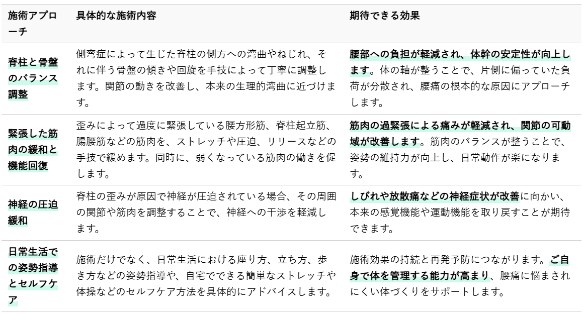 これらのアプローチを通じて、単に痛みを和らげるだけでなく、側弯症による体の歪みを改善し、機能的な体を取り戻すことを目指します。これにより、お客様がより快適で活動的な日常生活を送れるようになることを目標としています。