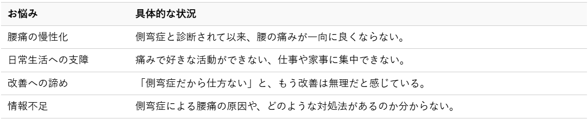 側弯症と診断され、長年続く腰の痛みに苦しんでいませんか。