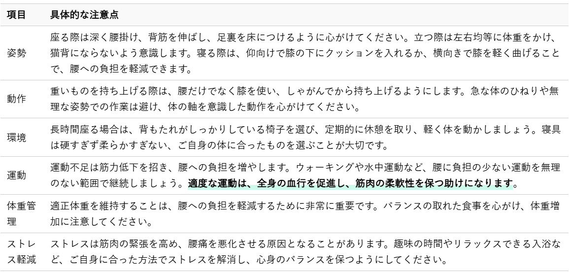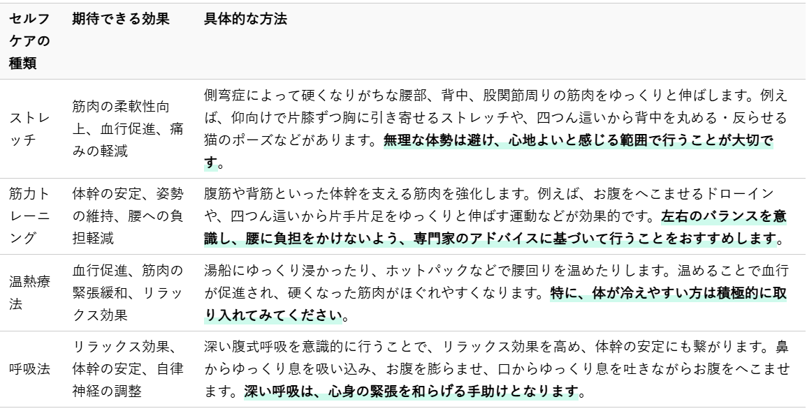 整体での施術によって腰痛の改善を目指す一方で、日々の生活習慣を見直し、ご自身でできるケアを取り入れることも非常に重要です。側弯症による腰痛は、日々の小さな積み重ねで悪化することもあれば、逆に改善の方向へ向かうこともあります。ここでは、腰痛を悪化させないための具体的な対策をご紹介します。