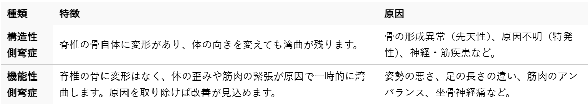 また、側弯症は大きく分けて「構造性側弯症」と「機能性側弯症」の二つに分類されることがあります。それぞれの特徴を理解しておきましょう。