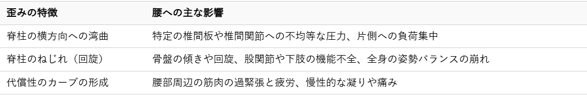 以下に、脊柱の歪みが腰に与える主な影響をまとめました。