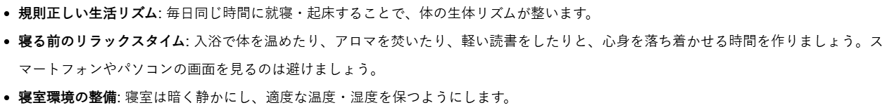 睡眠は、心身の疲れを回復させ、自律神経を整える最も基本的な方法です。以下の点を意識して、質の良い睡眠を心がけましょう。