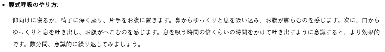 深い呼吸は、自律神経のバランスを整える上で非常に効果的です。特に腹式呼吸は、副交感神経を優位にし、リラックス効果を高めます。
