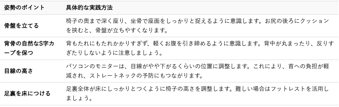 デスクワークやスマートフォン操作など、座っている時間が長い方は、以下のポイントを意識してみてください。
