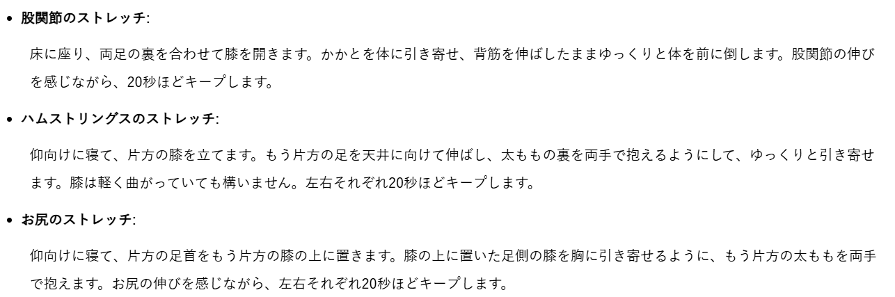 ストレッチは、痛みを感じる手前で止めることが大切です。無理に行うと逆効果になることがありますので、心地よいと感じる範囲で継続してください。