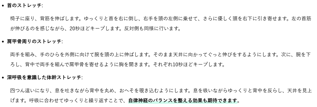 体の柔軟性を保ち、血行を促進することは、腰痛の緩和や自律神経の安定に役立ちます。毎日無理のない範囲で、簡単なストレッチを習慣にしましょう。