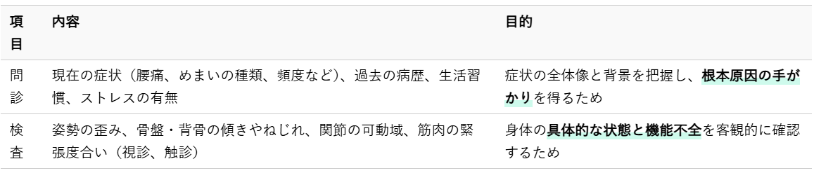 問診では、現在の症状だけでなく、過去の病歴、生活習慣、仕事の内容、ストレスの有無など、多岐にわたる情報を詳しくお伺いします。特に、めまいの種類(ふわふわする、ぐるぐる回るなど)、発生頻度、腰痛の性質(いつ、どこが、どのように痛むか)などを細かく確認することで、症状の全体像を把握します。