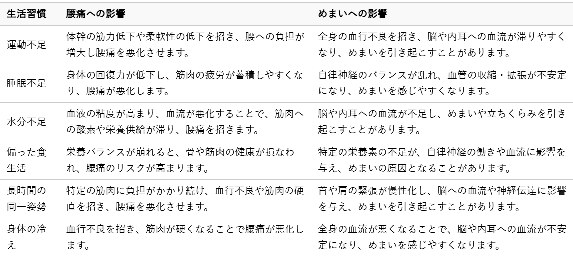 具体的な生活習慣と、それが腰痛とめまいにどう影響するかをまとめました。