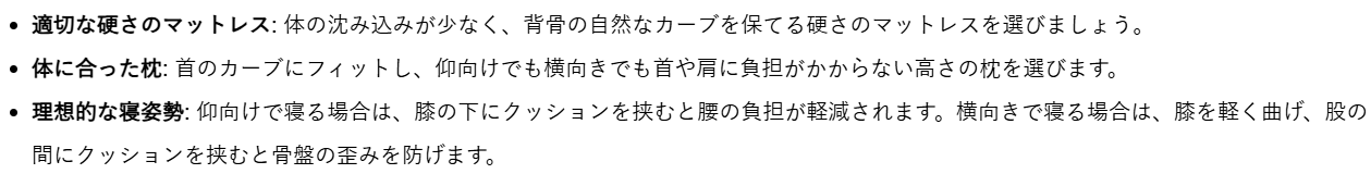 一日の約3分の1を占める睡眠時間は、体の回復にとって非常に重要です。寝具が体に合っていないと、寝ている間に腰や首に負担がかかり、症状悪化の原因となることがあります。