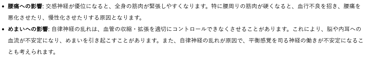 自律神経の乱れは、以下のように腰痛とめまいの両方に影響を及ぼします。
