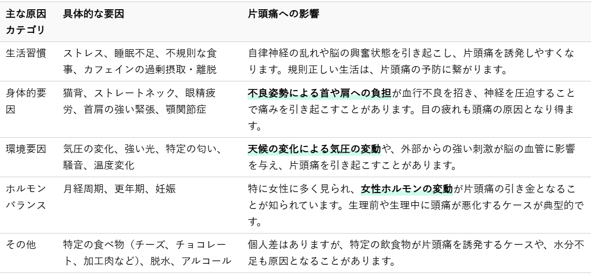 多くの方が悩まされている肩こりと片頭痛ですが、これら二つの症状には密接な関係があることをご存じでしょうか。実は、肩こりが片頭痛の引き金となったり、片頭痛が肩こりを悪化させたりと、互いに影響し合っているケースが少なくありません。ここでは、その深い関係性と、それぞれの主な原因について詳しく見ていきましょう。