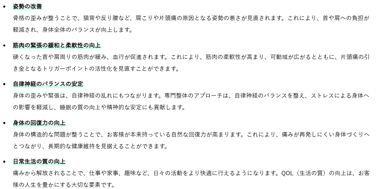 専門整体の施術を受けることで、単に肩こりや片頭痛が和らぐだけでなく、お客様の身体には様々な良い変化が期待できます。