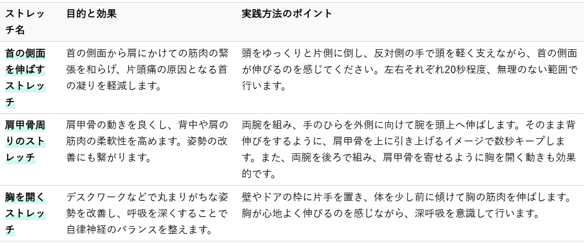 日々の生活の中で、肩や首周りの筋肉は知らず知らずのうちに緊張しています。定期的なストレッチは、筋肉の柔軟性を保ち、血行を促進することで、肩こりや片頭痛の予防に繋がります。以下に、ご自宅で手軽に実践できるストレッチをご紹介します。