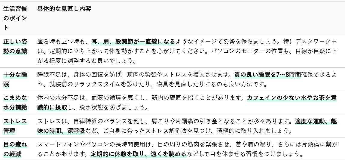 日々の生活習慣が、肩こりや片頭痛に大きく影響を与えていることがあります。施術で整った身体を維持し、痛みのない状態を長続きさせるために、以下の点に注意して生活を見直してみましょう。