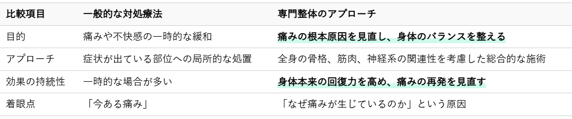 専門整体のアプローチは、一般的な対処療法とは異なる視点から身体を見つめます。以下の表で、その違いを比較してみましょう。