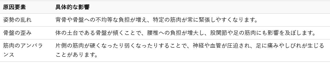 これらの歪みは、見た目では分かりにくいことも多く、徐々に進行するため、ご自身では気づきにくいものです。しかし、この歪みが、腰への過度なストレスとなり、結果として足の痛みへとつながっているのです。あなたの体の状態を詳しく見直すことで、痛みの本当の原因が見えてくることでしょう。