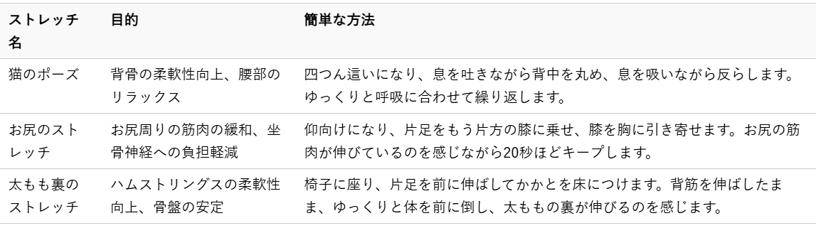 ここでは、自宅で手軽にできる簡単なストレッチの例をご紹介します。無理のない範囲で、毎日少しずつでも継続することが大切です。