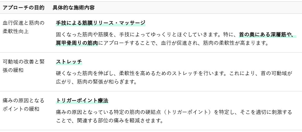 これらのアプローチを組み合わせることで、首の痛みや炎症を引き起こしている根源的な問題に働きかけ、症状の緩和だけでなく再発しにくい身体づくりをサポートします。