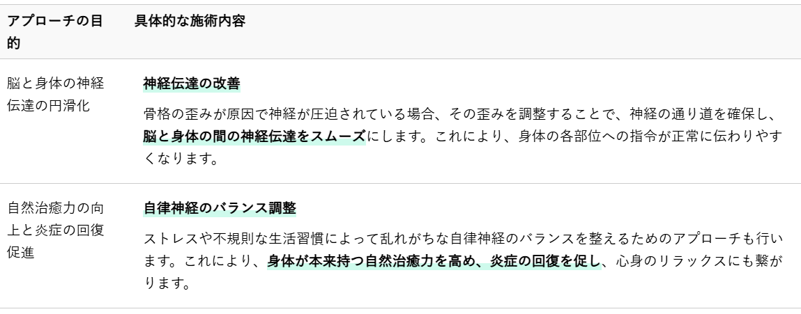 また、骨格の歪みを調整することで、神経への圧迫が軽減され、脳からの指令がスムーズに伝わるようになります。これにより、身体の各部位が正常に機能し、痛みを感じにくくなることが期待できます。