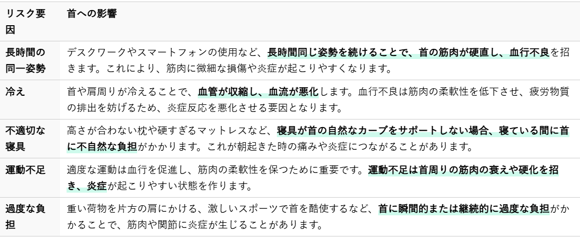 これらのリスク要因が重なることで、首の筋肉や関節に負担がかかり、微細な損傷や炎症が引き起こされることがあります。日常の何気ない習慣を見直すことが大切です。