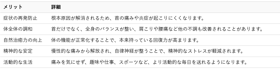 整体では、これらの根本原因に多角的にアプローチすることで、首の痛みと炎症の悪循環を断ち切り、身体が本来持つ自然治癒力を高めることを目指します。