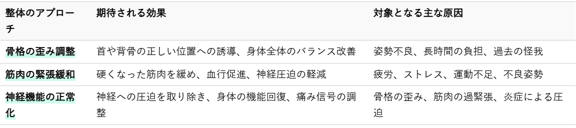 整体院では、首の痛みと炎症の根本的な原因に対し、多角的なアプローチを行います。単に症状のある部位だけでなく、身体全体のバランスを考慮し、骨格、筋肉、神経のそれぞれに働きかけることで、身体が本来持つ回復力を高め、症状の改善を目指します。