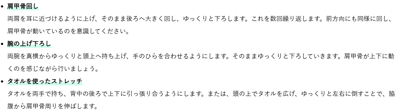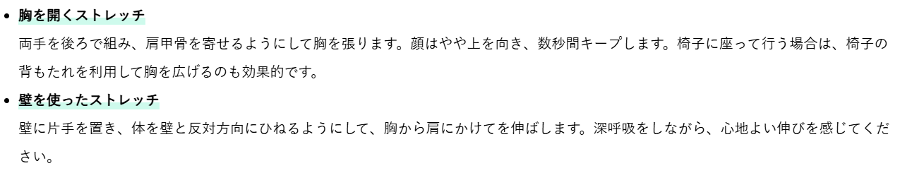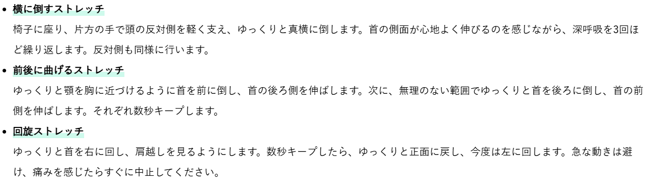 筋肉の緊張を和らげ、血行を促進するストレッチは、首や肩の痛みの緩和に欠かせません。無理のない範囲で、毎日少しずつ続けることが大切です。特に、デスクワークやスマートフォンの使用が多い方は、こまめに行うことをおすすめします。